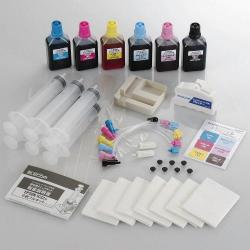 セット内容 : ・インクボトル×6本(各色1本) ・接続チューブセット×6セット ・スタンド×1個 ・吸引器×6本 ・吸引器インク色識別ラベル×1シート ・注入口開け治具×2個 ・ゴム栓×7個 ・リセッター×1個